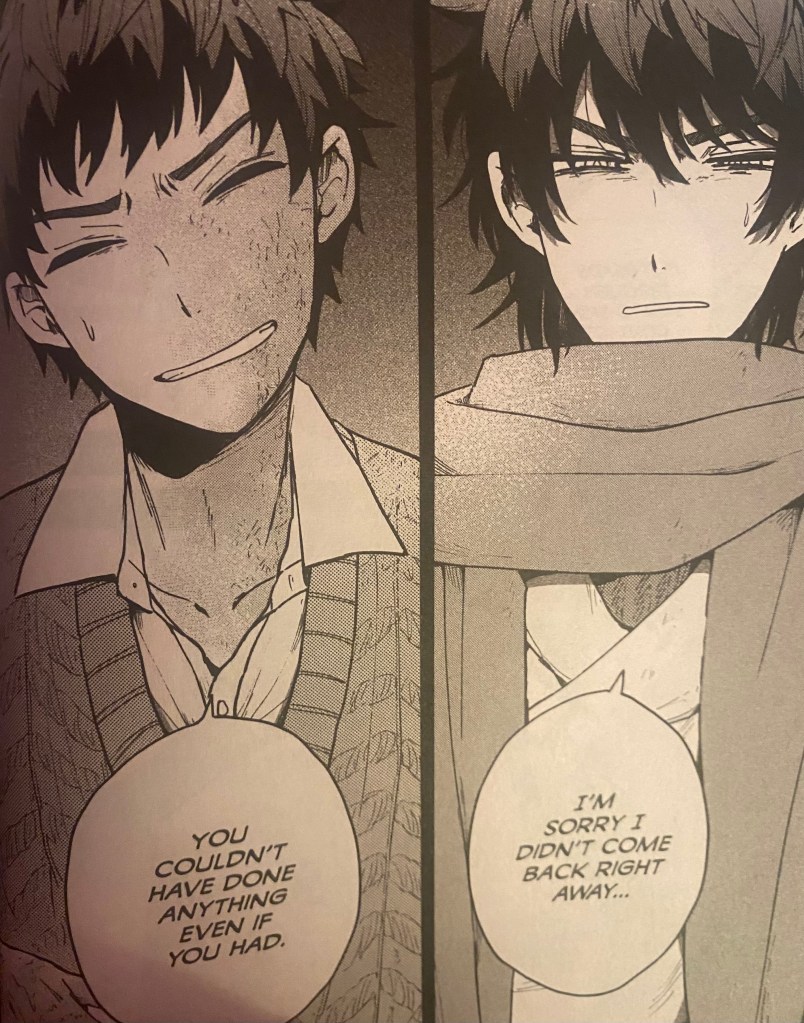 With Volume 2, they finally made progress getting to Neneo’s village. Halvard brought Neneo and Freya to a cabin to stay in while they would go to the village in the morning. Halvard is able to get Neneo to talk to him about what actually happened after giving him medicine. Neneo explained that even though him and his brother had tried to call the doctor to come to the village, and waited for them to show up, but the doctor never arrived.