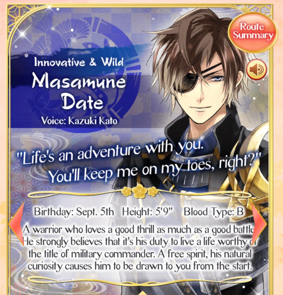 When I first started to play Ikemen Sengoku on the phone (way before I got the Vita version), I was instantly curious about Masamune. Maybe it’s because I consider myself to be a free spirit as well…or maybe it was the eyepatch. Either way, I thought he was and is massively sexy. Not to mention Kazuki Kato has an amazing voice as Masamune. Cybird obviously knew he was perfect for the role. 🙂