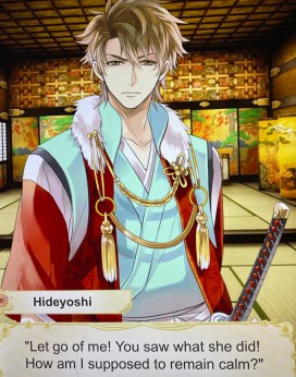 taken to Azuchi…and is still a victim of Hideyoshi’s mouthiness. He doesn’t give her a break whatsoever. In the beginning, it’s kind of hard to believe he’s actually a very caring soul. The warlords have council and Nobunaga wishes her to be there. He touches her and MC pushes his hand away. Of course Hideyoshi finds that to be an assault on Nobunaga and flips out at MC. Ieyasu and Mitsuhide have to hold him back from actually hurting MC, and Nobunaga tells him to stop. Of course, she’s his “lucky charm” so naturally he will say something to keep her safe. Even if it’s not for her.