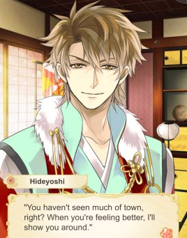 After this incident, Ieyasu comes to MC and tells her the pin was poison and that it would kill someone pretty quickly. MC feels sick to her stomach and never realized she was actually falling ill until the next morning. That’s when we see the sweetest side of Hideyoshi. He takes care of MC and tells her to take it easy. He wants to take her out to town when she’s feeling much better to make up for being such a douchebag to her.