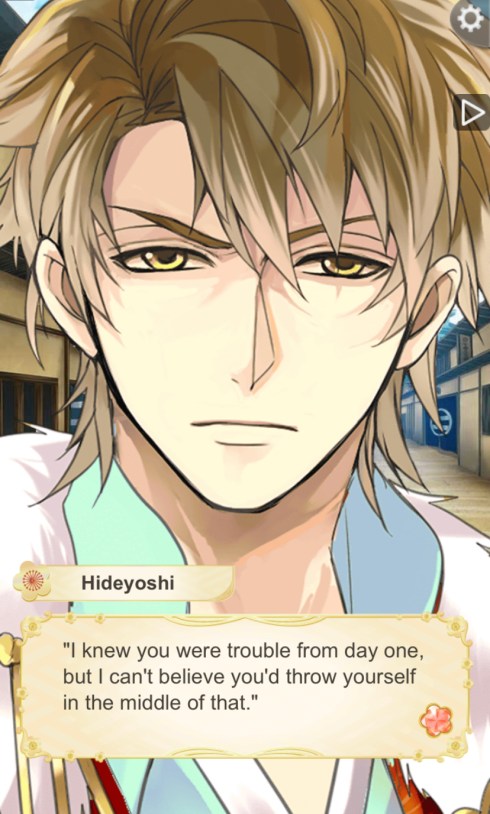 Just when she thinks she’ll get hit by one of the armored men, Hideyoshi stands in front of MC, protecting her. He isn’t too happy with how the warriors had treated the merchant, and the fact that they were going to strike a young woman. Hideyoshi saying he’s heard them at the gate makes MC realize he was most likely there to help her when she was done shopping.
