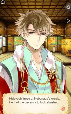 forcefully, is a full out attack on Nobunaga. Hideyoshi then pulls out his sword, shocking everyone else in the room. Nobunaga reprimands him, making it clear MC was not to be harmed in any manner. Nobunaga’s tone seems to be enough to leave Hideyoshi embarrassed.